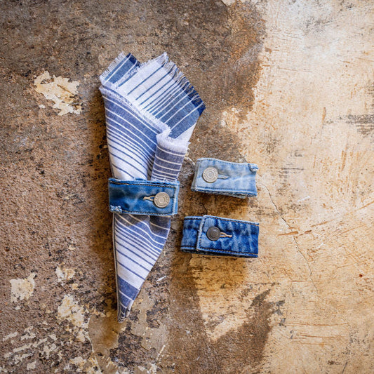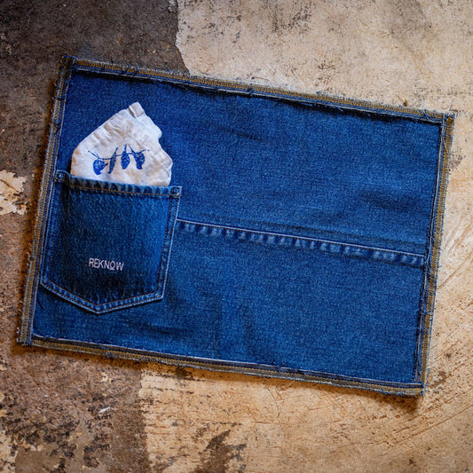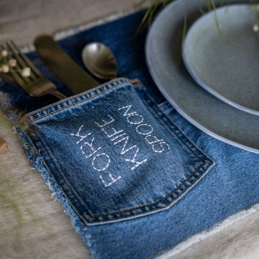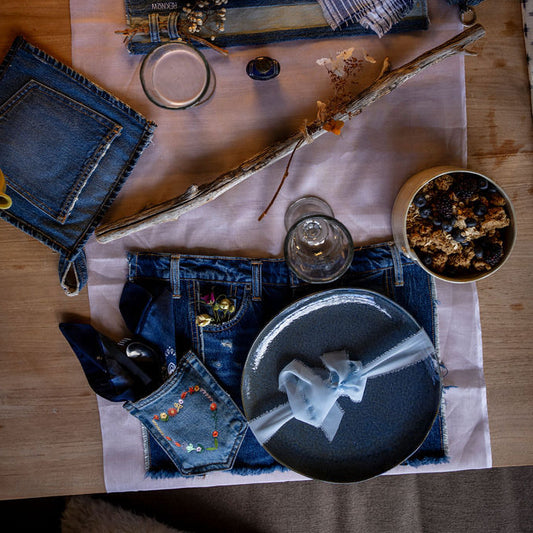 This upcycled denim tabletop collection transforms your dining experience into a one-of-a-kind showcase. Each piece—whether it’s placemats, potholders or oven mitts—is meticulously crafted from repurposed denim, making every item entirely unique. No two pieces are alike, offering a truly personalized touch to your table. The rich, textured fabric in varying shades of indigo creates a rustic yet sophisticated aesthetic. When paired with the "denim" dinnerwear collection, the table becomes a curated work of art, blending the tactile beauty of upcycled materials with the organic charm of hand-crafted ceramics. This collection is not just functional, but a statement—inviting conversation and admiration with every setting. Perfect for those who appreciate sustainable craftsmanship and love adding a touch of artistry to their home.