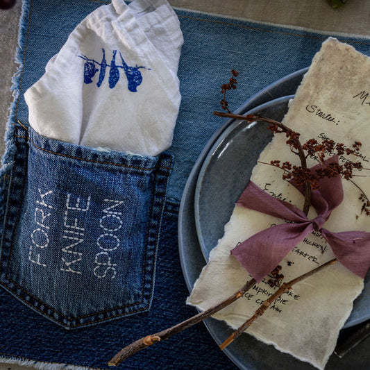 This upcycled denim tabletop collection transforms your dining experience into a one-of-a-kind showcase. Each piece—whether it’s placemats, potholders or oven mitts—is meticulously crafted from repurposed denim, making every item entirely unique. No two pieces are alike, offering a truly personalized touch to your table. The rich, textured fabric in varying shades of indigo creates a rustic yet sophisticated aesthetic. When paired with the "denim" dinnerwear collection, the table becomes a curated work of art, blending the tactile beauty of upcycled materials with the organic charm of hand-crafted ceramics. This collection is not just functional, but a statement—inviting conversation and admiration with every setting. Perfect for those who appreciate sustainable craftsmanship and love adding a touch of artistry to their home.